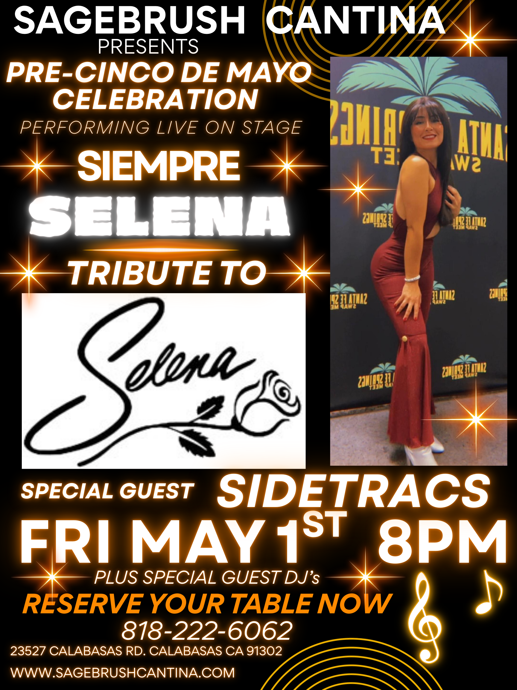 Friday May 1st 8pm Featuring live on stage "Siempre Selena" Performing All Your Favorite Selena Hits.